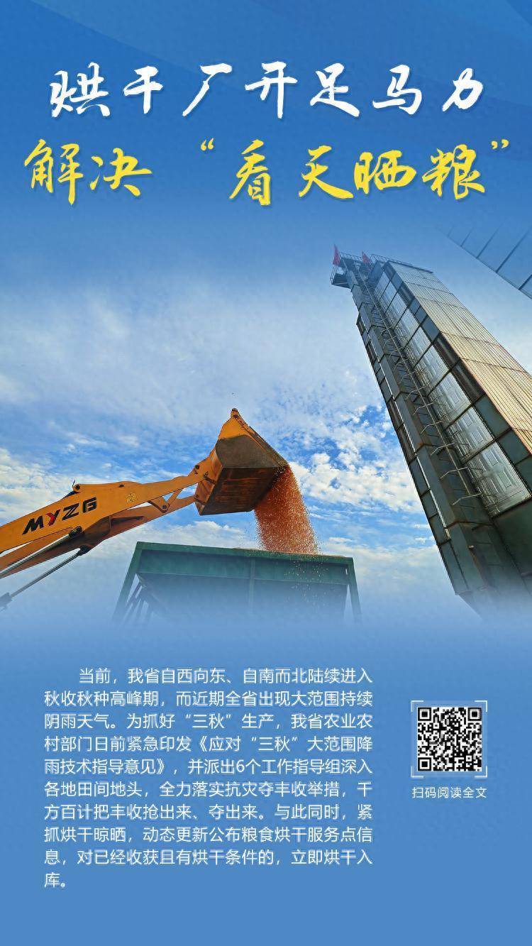 现时,我省自西向东、自南而北连接干预秋收秋种岑岭期,而近期全省出现大领域持续黯澹天气。为合手好“三秋”坐蓐,我省农业农村部门日前迫切印发《叮咛“三秋”大领域降雨工夫劝诱宗旨》,并派出6个责任劝诱组潜入各地田间地头,全力落实抗灾夺丰充举措,千方百计把丰充抢出来、夺出来。与此同期,紧合手烘干曝晒,动态更新公布食粮烘干处事点信息,对也曾收货且有烘干条目的,立即烘干入库。