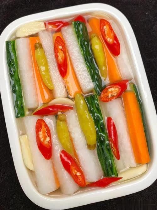 4. 冷藏腌制:将处治好的蔬菜条放入调好的泡制液中,确保一齐食材浸没在汁水中,密封后放入雪柜冷藏。刻薄冷藏12小时以上,仪态更佳。