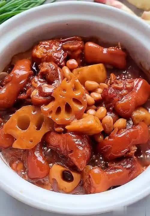 材料:莲藕 1 节、猪蹄 1 只、葱姜、料酒、生抽、老抽、冰糖、盐适量。