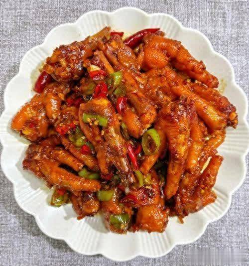 3. 另起一个锅,放少量油,把蒜末和青红辣椒圈爆香,然后倒入炖好的鸡爪,加一勺干辣椒面、一勺生抽,翻炒均匀把汁收浓,临了放一勺鸡精,拌匀就好了。