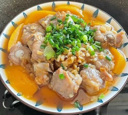 材料:南瓜 1 块、排骨 300 克、蒜、豆豉、生抽、蚝油、淀粉、盐适量。