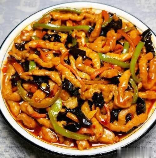 食材:肉丝、木耳、胡萝卜、青椒、蒜末、葱