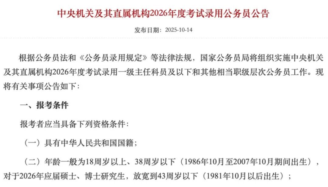 (图源:国度公事员局网站) 一 此前,宇宙规模内考公、考纪年岁线多合并在35周岁。年岁昭着不是职场才调的分界线,但它照实将许多有志于人人服务的东谈主挡在门外,成了难以结巴的硬杠杠。 放眼总共这个词处事阛阓,“35岁焦急”困扰着许多职场东谈主。一些企业只招35岁以下职员,更有甚者对35岁以上职工进行淘汰,让好多求职或在任者倍感压力。说一句职场东谈主苦“唯年岁论”久矣,并非夸大。 昨年,中共中央、国务院发布《对于践诺处事优先计谋促进高质地充分处事的认识》,明确提议保险对等处事职权,排拓荒域、身份、性别、年岁等影响对等处事的隔离理摈弃和处事烦恼,流畅社会流动渠谈。四川、上海、江苏等多地也放宽了公事员或功绩单元招聘中的年岁摈弃。 这归国考在更平日意旨上铲除“35岁门槛”,是对东谈主才招录机制的一次改变,可谓开了个好头。 凭证公告,2026年国考共筹画招录3.81万东谈主。但算作东谈主才采取的风向标,其影响规模远不啻于此。企功绩单元可参照国考圭臬,宽心放宽招录东谈主员年岁摈弃,让东谈主岗适配、能者上。不同庚岁段求职者有望各自弘扬上风,酿成更怒放包容的职场文化。