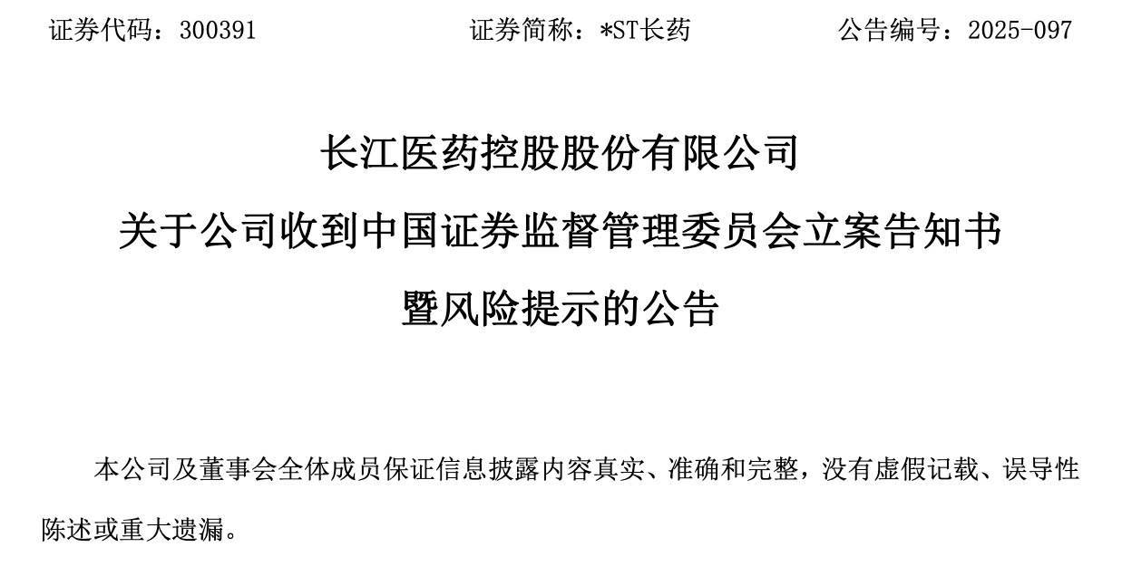 日前,*ST长药发布公告称,公司于11月7日收到中国证券监督照拂委员会(以下简称“中国证监会”)下发的《立案见知书》,因公司涉嫌如期禀报等财务数据造作记录,中国证监会决定对公司立案。