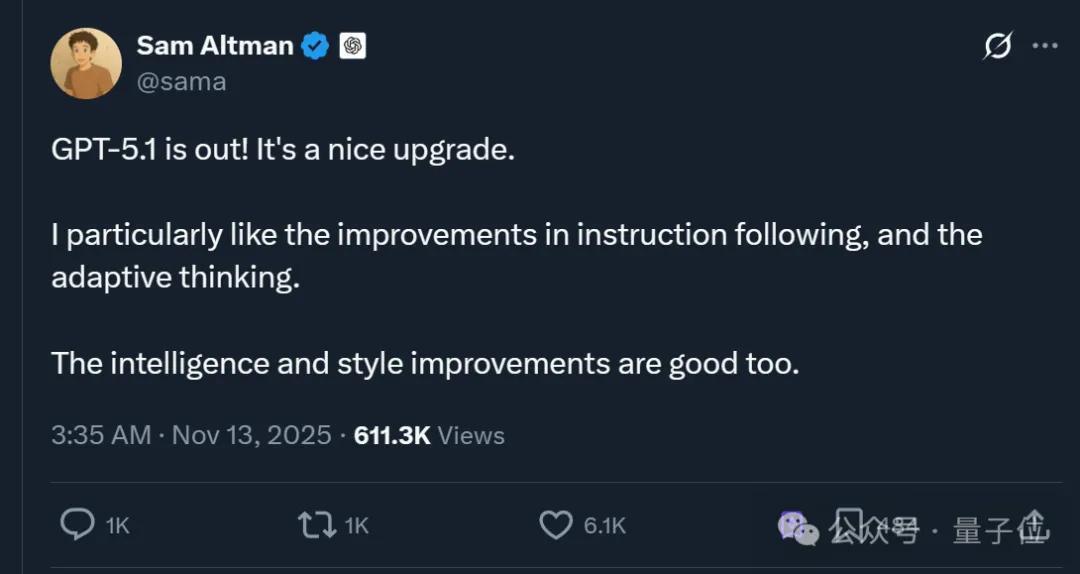 模子径直升级为GPT-5.1,官方主击柝智能、更具对话性。
